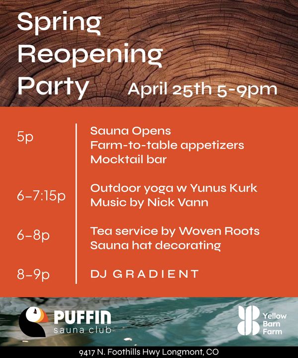 Puffin Sauna Club will return with a completely transformed setup — we’ve built a new deck, a proper patio, a fire pit, renovated the creekside, and enhanced the changing tent — and we want you to be the first to experience it. Come see what we've been building, then on April 25th, celebrate with us. Tickets available below.